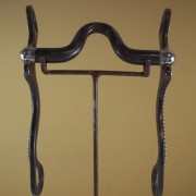Here’s a medium port Maheu bit with loose shanks. The bit has engraved sterling overlay and silver dots down the shanks. This is a great reining or pleasure bit. It has generous tongue relief and slightly delayed action with the swept back shanks. Great for the horse ready for a solid port and perhaps a good choice for one that needs steadying up.
